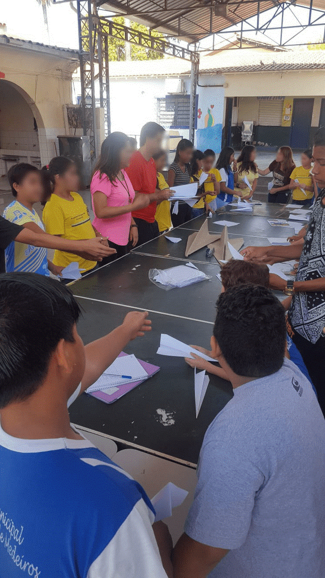 Partindo desses pressupostos, propusemos aos professores da Escola Municipal Pedro Paulo de Medeiros o desafio de realizar um projeto que envolvesse a simples brincadeira do aviãozinho de papel, articulando diferentes áreas de conhecimentos do currículo escolar do Ensino Fundamental II (6º ao 9º ano), entre elas: Matemática, História, Geografia, Arte e EF. Nesse sentido, o brinquedo (avião de papel) e as atividades (brincadeiras, competição…) se tornaram instrumentos-chave para que pudéssemos desenvolver, ao longo do projeto, mecanismos de aprendizagem desses diferentes conhecimentos.