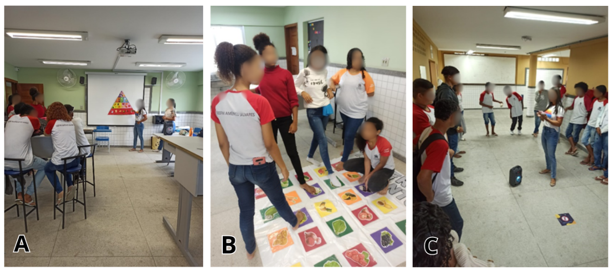 Para essa atividade, foi convidada a nutricionista responsável pela alimentação da escola para um bate-papo com os adolescentes. A convidada iniciou explicando como era elaborado o cardápio e quais as formas de preparo dos alimentos. Em seguida, os estudantes fizeram perguntas sobre os tipos de alimentos ofertados na escola e sugeriram ajustes relacionados à quantidade, qualidade e diversificação dos alimentos servidos. Logo após, duas acadêmicas do curso de Nutrição, de uma faculdade privada, fizeram uma breve explicação utilizando uma pirâmide alimentar confeccionada em EVA, abordando os tipos e as quantidades ideais de alimentos que devem ser consumidos para uma alimentação equilibrada (Figura 4A). Na sequência, realizaram uma série de atividades, incluindo “batata quente” e o jogo Twister (Figuras 4B e 4C). Os estudantes foram divididos em dois grupos de 15 pessoas, que se revezaram nas atividades de perguntas e respostas. Essa sequência de atividades foi bastante apreciada pelos alunos, sendo perceptível o alto nível de engajamento nas dinâmicas propostas.