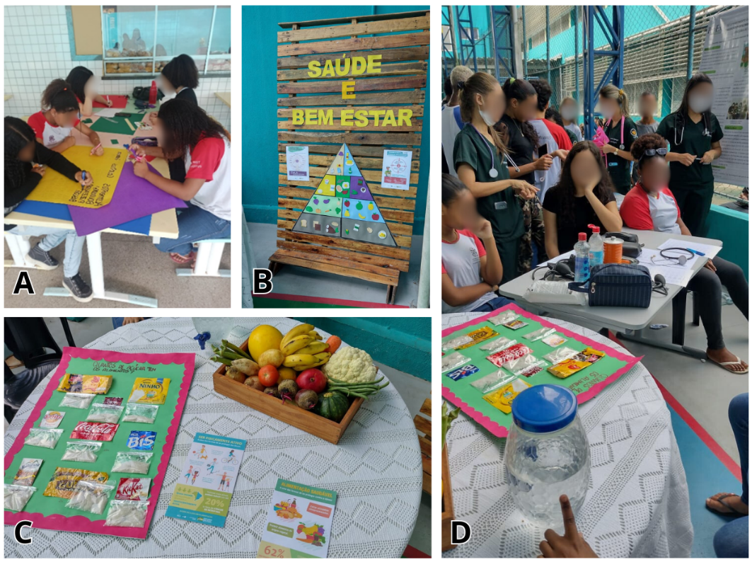 Apresentação dos produtos finais: vídeos, fotografias, relatos, confecção de prato saudável, montagem de pirâmide alimentar, exposição de jogos didáticos e mesa temática sobre alimentação saudável. Ao final da disciplina, foi realizada, como parte da avaliação, a exposição das atividades desenvolvidas (produtos finais). A apresentação ocorreu na quadra da escola, juntamente com os demais trabalhos das eletivas desenvolvidas ao longo do trimestre (Figura 5, de A a D). Paralelamente, também foi realizada uma ação em saúde, com aferição de pressão arterial, cálculo do IMC e verificação dos batimentos cardíacos, conduzida por acadêmicos de enfermagem da UFES, envolvendo desta vez todos os estudantes da escola, e não apenas os da disciplina (item D).