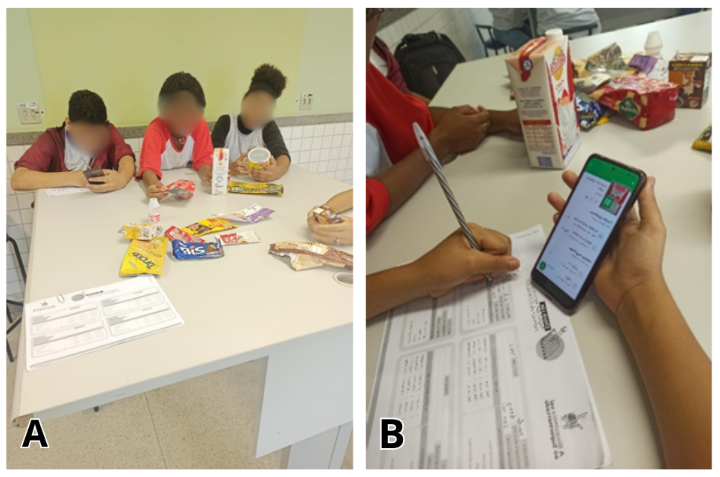 Figura 3: Atividade de análise das informações nutricionais. A e B)Grupo analisando as informações por meio do app Desrotulando e preenchimento de tabela