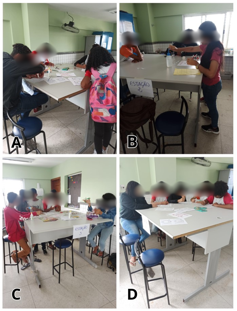 Figura 2: Atividade de rotação por estações.A) Estação 1 – Monte seu prato; B) Estação 2 – Conhecendo os componentes químicos dos alimentos; C) Estação 3 – classificando os alimentos; D) Estação 4 – Kahoot
