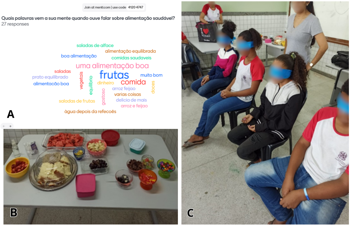 Figura 1: A) Slide com a nuvem de palavras elaborada pelos estudantes; B) Alimentos utilizados na dinâmica de degustação e classificação dos alimentos; C) Estudantes participando da dinâmica