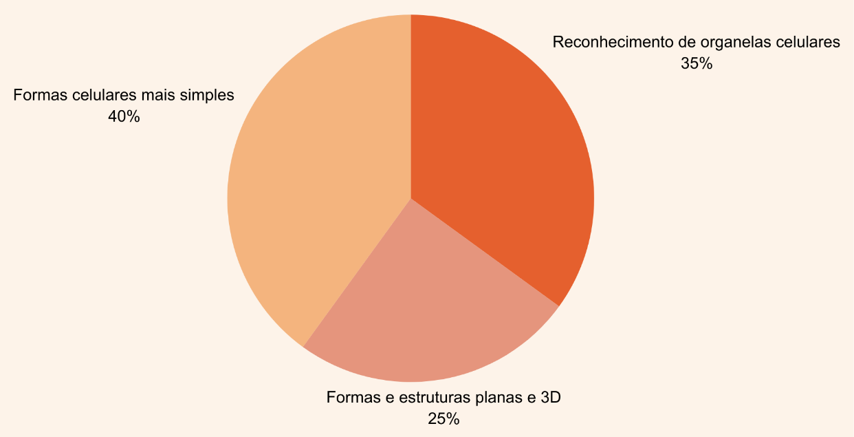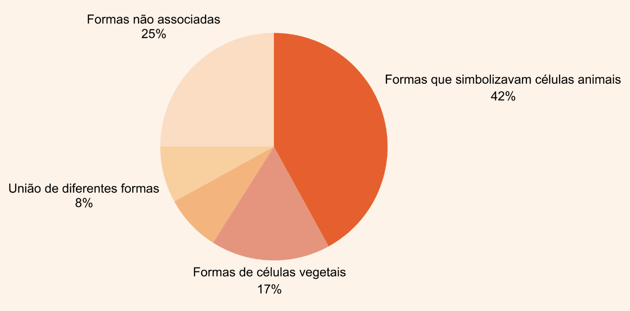 Quando solicitado que os alunos desenhassem imagens que, para eles, representassem uma célula, foi observado que eles reconheciam parcialmente as diferentes formas celulares, sendo possível visualizar que 42% demonstraram formas que simbolizavam células animais; 17% conheciam formas de células vegetais; 8% células bacterianas; 8% demonstraram desenhos que uniam diferentes formas; e 25% criaram formas que não podiam ser associadas (Gráfico 4)