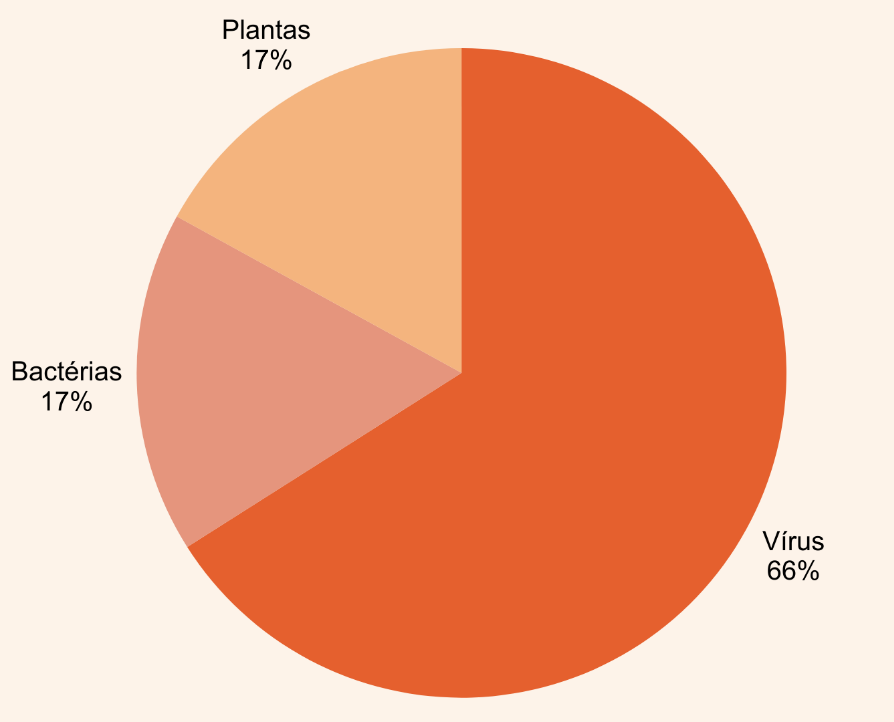 Quando questionados sobre os seres não constituídos por células, 66% responderam corretamente no pré-teste, indicando que, dentre as alternativas, os vírus eram os únicos seres não celulares; ainda, 17% assinalaram a alternativa correspondente a bactérias e 17% indicaram as plantas (Gráfico 9).