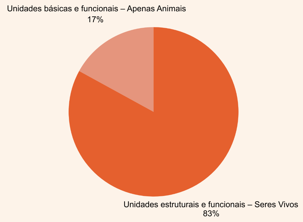 Após as intervenções, frente à aplicação do segundo questionário, 100% dos discentes passaram a relacionar o conceito como sendo a unidade básica de todos os seres vivos, responsável por sua estrutura e função, sendo perceptível o efeito positivo das intervenções para o entendimento dos 17% que antes não associavam o conceito e reforçando a compreensão dos demais acerca do exposto. Junqueira e Carneiro (2012) destacam que as células podem ser definidas como unidades constituintes de todos os seres vivos, as quais podem existir tanto de forma isolada, nos seres unicelulares, quanto formando arranjos ordenados, constituindo o corpo dos seres pluricelulares. Em complemento, Proença (2010) ressalta que as células são estruturas que compõem órgãos e tecidos dos seres vivos, participando de sua estrutura e exercendo funções específicas, sendo, deste modo, a unidade básica dos seres vivos. Dessa forma, Nascimento (2016) demonstra que estudar as células é fundamental para possibilitar a compreensão dos processos vitais, sendo, portanto, um conteúdo básico para o entendimento da biologia.
