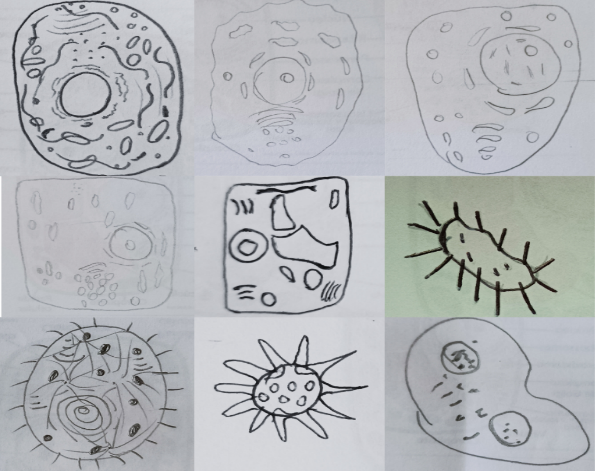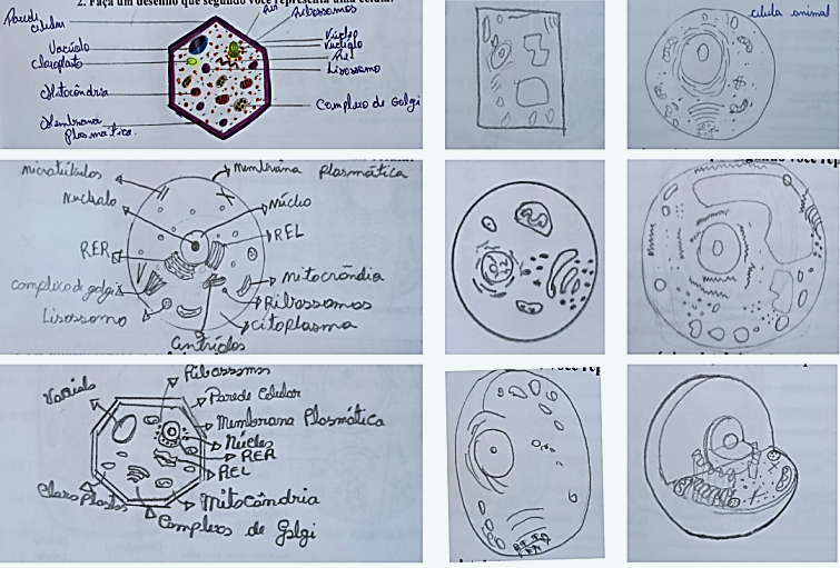Apesar de 67% dos desenhos terem uma relação com as formas celulares, pode ser vislumbrado que os mesmos eram vagos e que, apesar de reconhecerem as formas, os discentes não dispunham de segurança sólida sobre as estruturas e os conhecimentos demonstrados. Isso pode ser observado a partir da visualização das imagens a seguir: