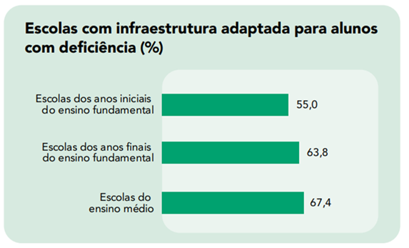 No censo escolar de 2019, conforme mostrado na Figura 2, foi constatado que a porcentagem de escolas com infraestrutura adaptada para deficientes no Brasil atingiu os seguintes índices: 55% das escolas são adaptadas para os anos iniciais do Ensino do Fundamental, 63,8% para os anos finais do Ensino Fundamental e 67,4% para o Ensino Médio (IBGE, 2022).