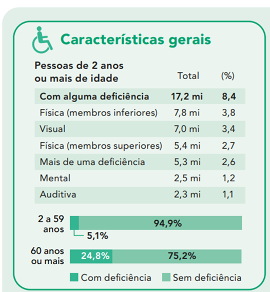 INSTITUTO BRASILEIRO DE GEOGRAFIA E ESTATÍSTICA (IBGE). Coordenação de População e Indicadores Sociais. Pessoas com deficiência e as desigualdades sociais no Brasil. Rio de Janeiro: IBGE, 2022. Disponível em: https://biblioteca.ibge.gov.br/visualizacao/livros/liv101964_informativo.pdf. Acesso em: 8 out. 2023.