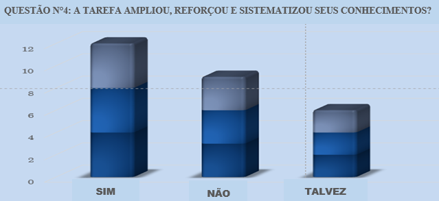 No que se refere à ampliação, reforço e sistematização do conhecimento, verificou-se que doze dos estudantes responderam que a tarefa com o programa colaborou para o aprendizado da disciplina; porém, a pesquisa aponta que nove participantes do estudo alegaram não ter assimilado adequadamente o conteúdo durante a aula, apresentando dificuldades para manusear o programa. Também, um grupo de seis estudantes se manteve neutro quanto ao feedback da proposta de estudo.