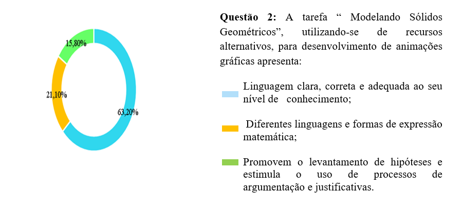 O resultado que liderou essa parte do formulário foi a linguagem clara, correta e adequada ao nível de conhecimento dos estudantes, com 63,2% dos resultados. Muitos alunos concordaram com a clareza da tarefa e reconheceram seus benefícios para a aprendizagem. Por outro lado, verificou-se, nessa mesma questão, que 21,1% dos alunos consideraram diferentes linguagens e formas de expressão matemática na tarefa, sendo que 15,8% perceberam o levantamento de hipóteses e o estímulo à argumentação e justificativas durante a prática.