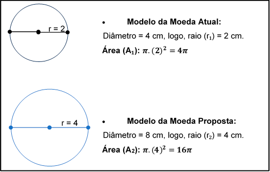 Com esses modelos, os alunos puderam comparar a quantidade de material de acordo com a área de cada círculo e, ao calcular a razão entre as áreas (fase de Resolução), descobriram que a nova moeda, apesar de ter o dobro do diâmetro, utilizaria quatro vezes mais chocolate.