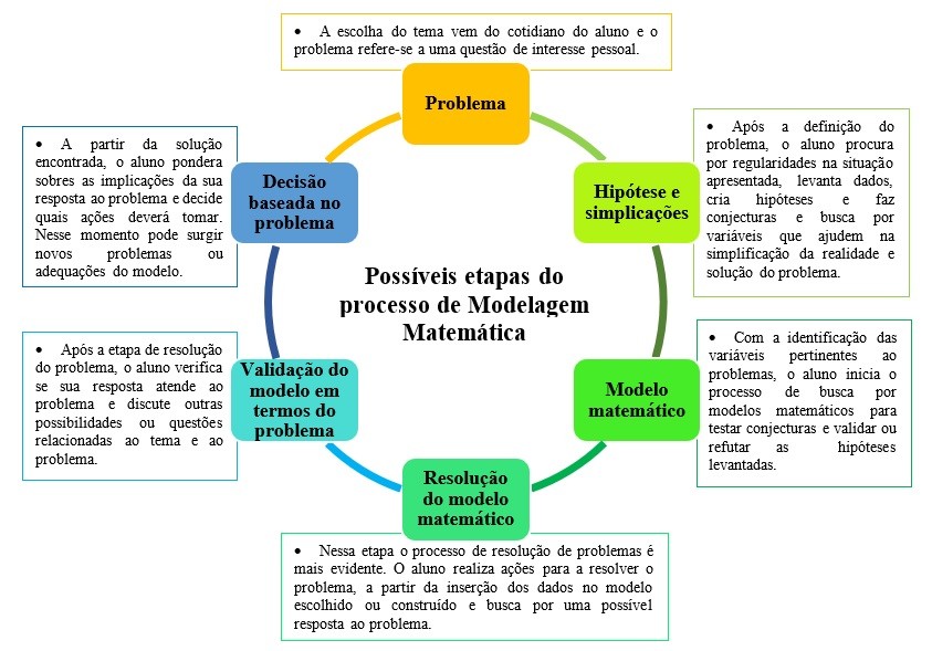 Nosso entendimento dessas etapas, aliado à leitura do trabalho de Almeida, Silva e Vertuan (2020), que descrevem a matemática como uma linguagem viva e dinâmica, motivou nossa tentativa de inserção da modelagem em turmas do 3º ano do ensino médio de uma escola pública estadual. Para aplicar essa metodologia, estruturamos nossas aulas a partir das seguintes questões: como introduzir a Modelagem Matemática para alunos acostumados com métodos tradicionais? Quais desafios e obstáculos são percebidos pelos alunos durante essa mudança? Inicialmente, organizamos o processo em quatro fases: Interação, Matematização, Resolução e Interpretação (Almeida; Silva; Vertuan, 2020), seguindo passos que incluem a leitura cuidadosa do enunciado, identificação e organização de dados, formulação de estratégias e resolução do problema, além da interpretação dos resultados.