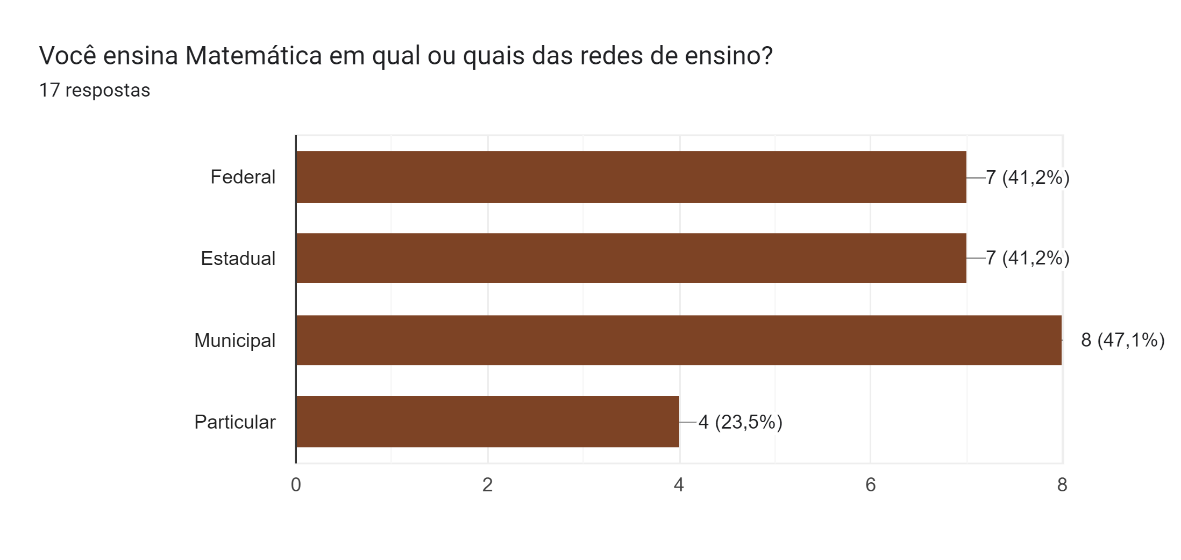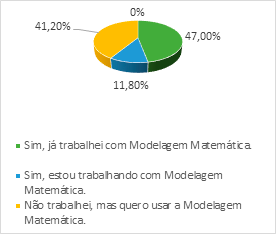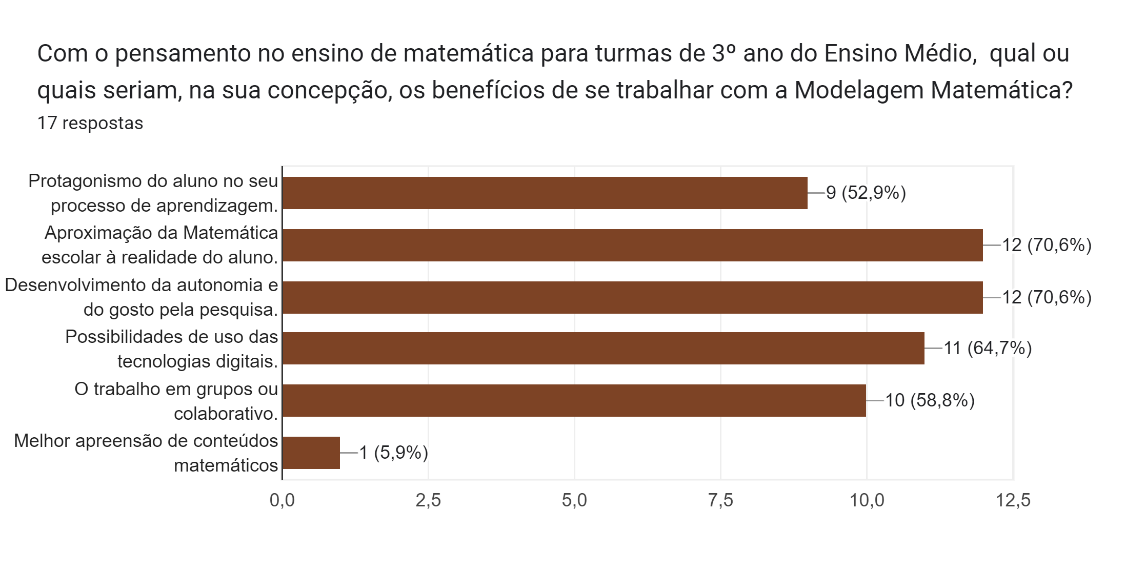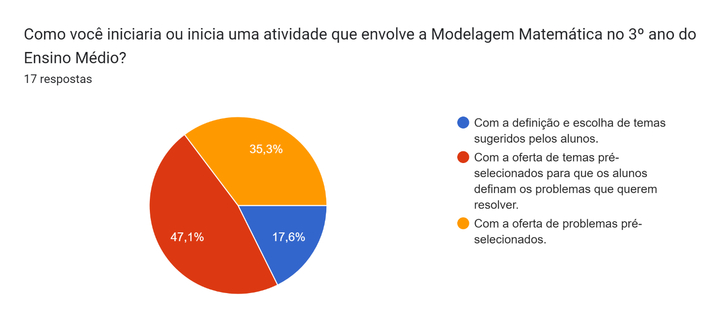 Conforme detalhado nas seções anteriores, a pesquisa investigou as percepções de professores sobre a Modelagem Matemática no Ensino Médio, com ênfase em seus desafios e potencialidades. A partir de um questionário, foram coletadas informações de 17 professores, selecionados por amostragem snowball (Bockorni; Gomes, 2021), o que permitiu alcançar docentes com experiência ou interesse em Modelagem Matemática.