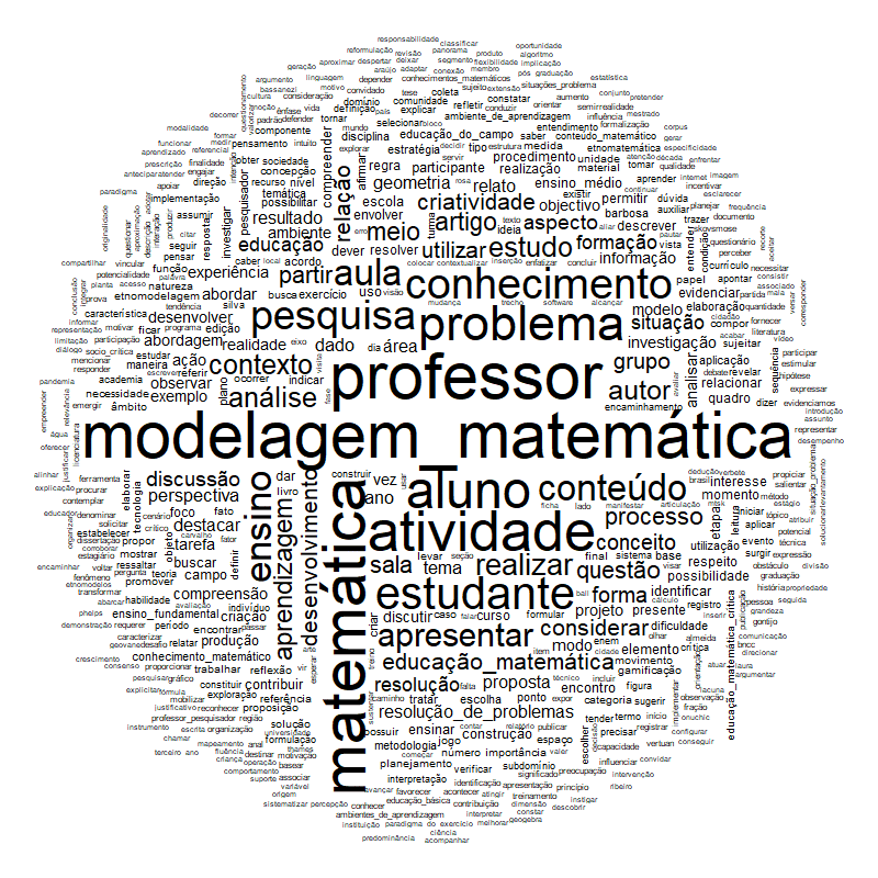 A nuvem de palavras (Figura 5), que destacou termos como "Modelagem Matemática", "Professor", "Aluno" e "Problema", evidenciou a centralidade do tema de pesquisa no contexto pedagógico e na prática docente.