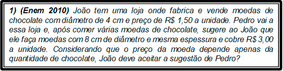 Ao iniciarmos a investigação e o debate dessa questão (fase de Interação), a primeira reação dos alunos foi, em geral, concordar com a sugestão de Pedro. O raciocínio intuitivo predominante foi o de proporcionalidade direta: “se o diâmetro dobrou, o preço também deveria dobrar” (Aluno 1). O debate em sala foi direcionado por questionamentos como: “O que determina a quantidade de chocolate em uma moeda: o seu diâmetro ou sua superfície?”. Essa discussão foi crucial para que os alunos percebessem a necessidade de analisar a área das moedas.