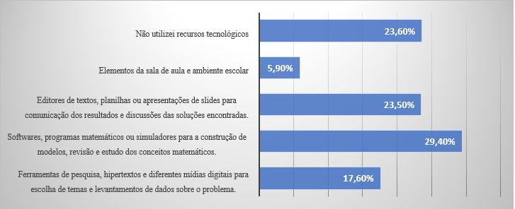 Outro ponto foi o uso da tecnologia, que, em muitas práticas, ainda é considerado um privilégio do professor. Esses paradigmas são discutidos por Bastos e Rosa (2020), Tortola e Silva (2022), Almeida, Silva e Vertuan (2020), Ramon et al. (2022) e Bissolotti e Titon (2022), e foram mencionados pelos professores respondentes da pesquisa.