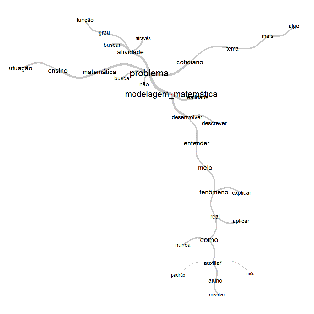 No grafo gerado pelo software Iramuteq, apresentado no Gráfico 4, a palavra “problema” emergiu como o vértice central, com conexões a termos como “Modelagem Matemática”, “cotidiano” e “atividade”. Os professores ressaltaram que a modelagem oferece oportunidades para desenvolver habilidades como pensamento crítico e cidadania, em consonância com documentos oficiais de educação, como os PCN (Brasil, 2000) e a BNCC (Brasil, 2018).