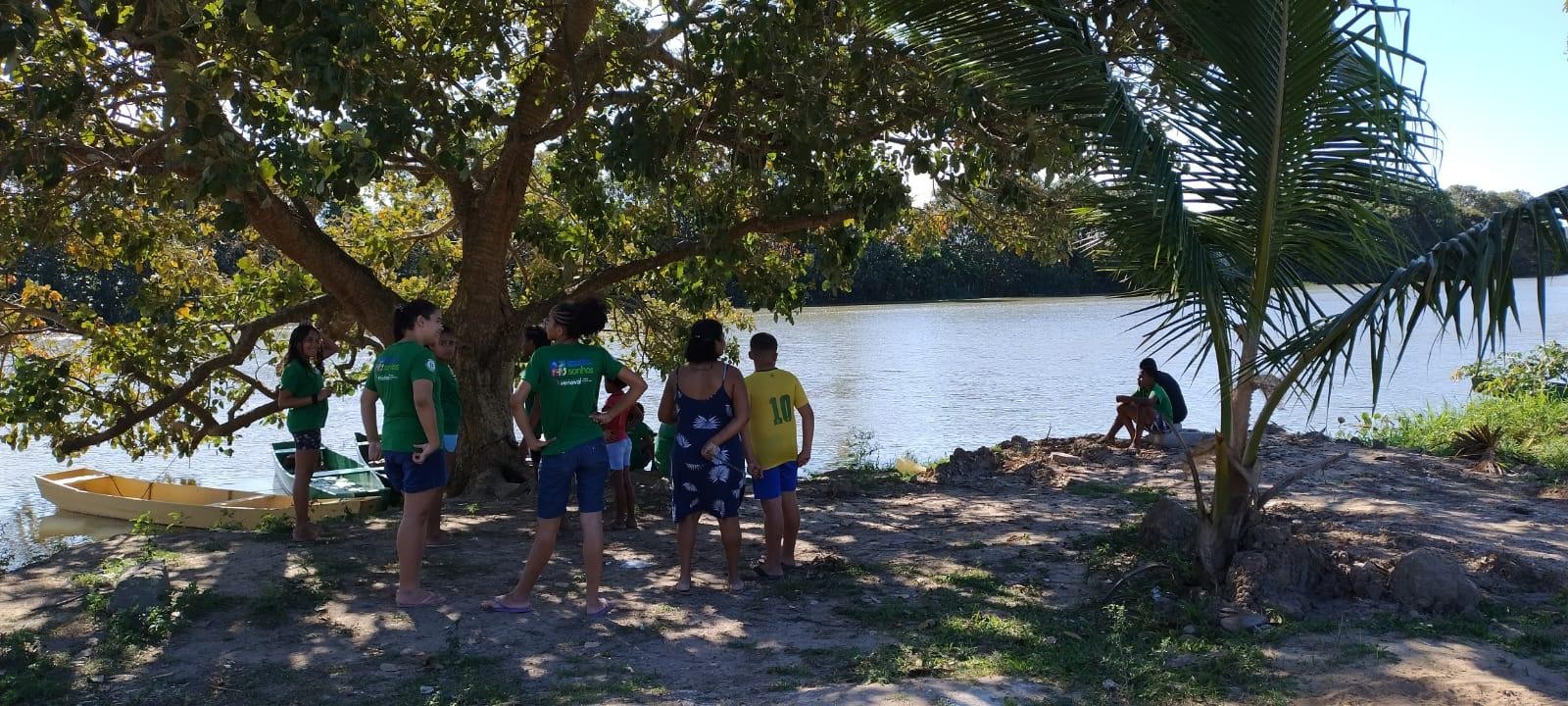 Fomos até onde deságua a nascente e chegamos à beira do rio. A educadora social que atua no Cesrevi como cozinheira e auxiliar de demais serviços, que estava guiando o passeio, começou a narrar suas brincadeiras ali, inspirando movimentos infantis nas crianças e em mim: “Aqui a gente brincava assim, quando criança: pulava daqui pra lá, no rio. A gente pegava folha de aninga e boiava em cima dela, ia até do outro lado do rio”. Aproveitamos a vista; naquele momento, senti que fazia parte de algo, estava inserida em algo e me senti segura à beira do rio.