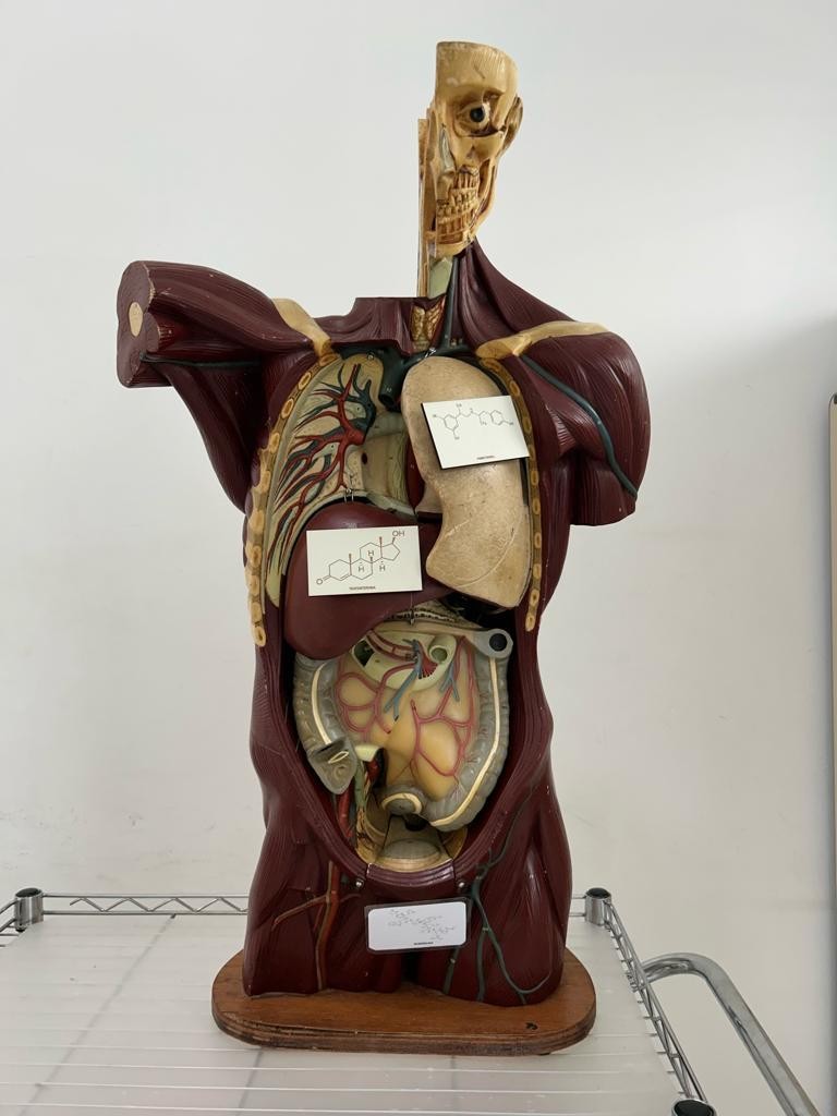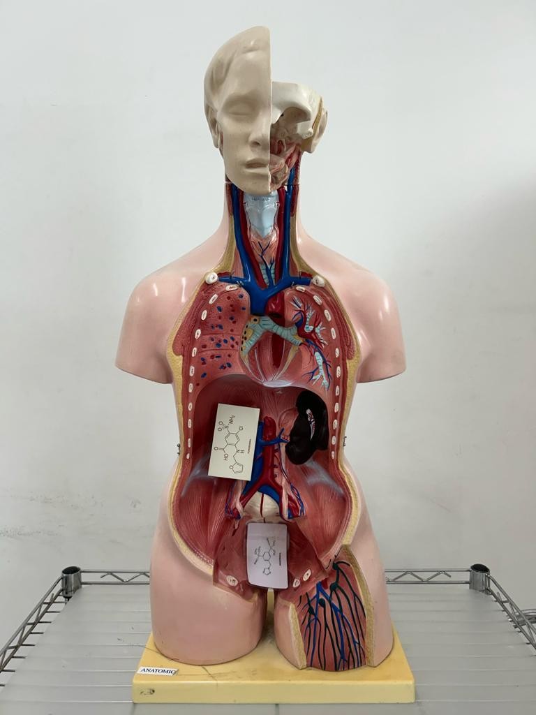 Nesta pesquisa, foram utilizados dois bonecos cedidos pelo Laboratório de Biologia do Instituto Federal Fluminense – Campus Campos Centro: um modelo feminino (Figura 1A) e outro masculino (Figura 1B). Ambos apresentavam órgãos removíveis e fixos. Para aprimorar a experiência, foram elaboradas cinco fichas identificadoras destinadas aos seguintes órgãos: fígado, pulmão, sistema reprodutor masculino, sistema reprodutor feminino e rins. As substâncias associadas a esses órgãos foram, respectivamente, testosterona, fenoterol, buserelina, anastrozol e furosemida. Os bonecos podem ser substituídos por desenhos ou esquemas (não há distinção entre feminino e masculino; optou-se apenas pela utilização dos bonecos já disponíveis), e as placas podem ser substituídas por outro material.