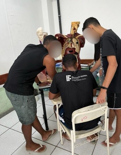Os alunos realizaram a identificação das substâncias dopantes e dos órgãos afetados por elas, fixando fichas com o nome das substâncias nos órgãos correspondentes em bonecos. Para isso, receberam um material de apoio contendo uma breve explicação sobre os efeitos do uso desses medicamentos no corpo humano.