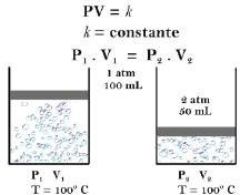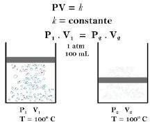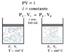 (T) e volume (V) constantes (A) e os efeitos sobre o volume quando se aumenta a pressão (B-C), mantendo-se as demais variáveis (T e V) constantes.