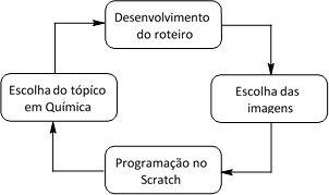 Foi utilizado um ciclo de criação direta, que começa com a escolha do tópico em Química, o desenvolvimento do roteiro em forma de aula, a escolha das imagens que irão compor o contexto/cenário e a programação dos movimentos que se quer simular, utilizando as facilidades do Scratch, conforme ilustrado pela Figura 1.
