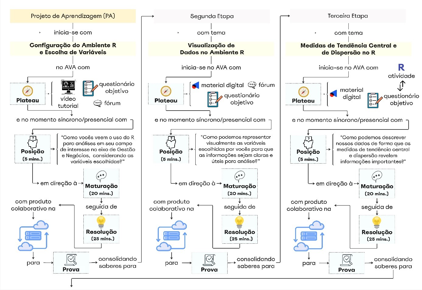 Nesse sentido, o produto deste artigo é a proposta de intervenção pedagógica em que a metodologia da Sequência Fedathi (SF) é integrada à estratégia de Projeto de Aprendizagem (PA), com o intuito de desenvolver uma proposta em que o uso de estratégias ativas promova o desenvolvimento cognitivo-conceitual, articulado à inserção da linguagem R no ensino de Estatística no nível técnico. Além da inovação na integração entre SF e PA, e da introdução de um recurso pedagógico aberto e gratuito — o R —, utiliza-se a ferramenta mapa conceitual (MC) no design da intervenção pedagógica, o que é ainda pouco explorado na literatura, seja em termos teóricos, seja por meio de exemplos práticos como os aqui apresentados. A partir da questão norteadora, articulam-se AVA e recursos em nuvem para um percurso educativo mais eficaz e colaborativo.