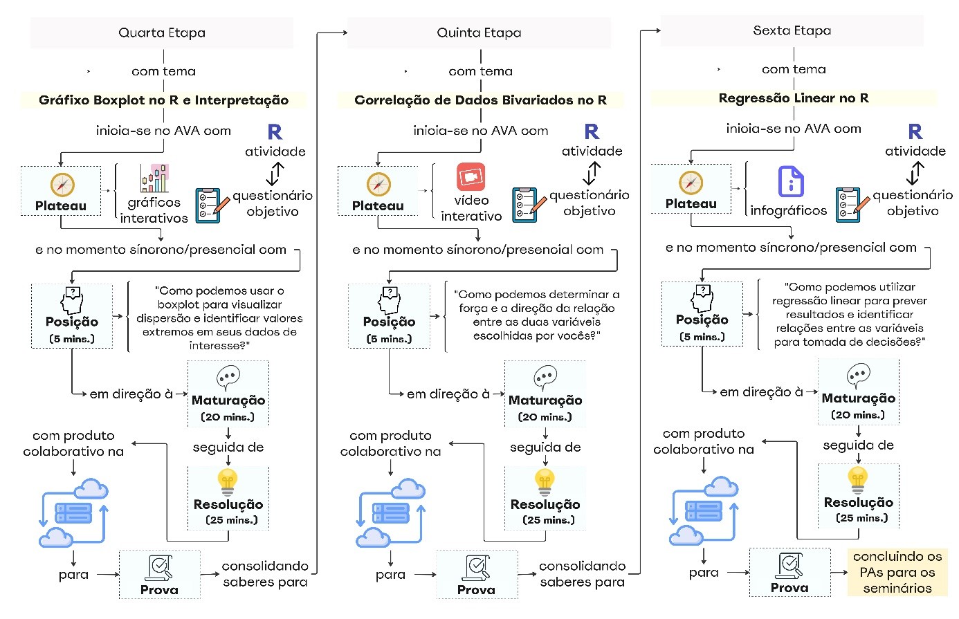 Na etapa inicial, os alunos acessam um vídeo tutorial no AVA sobre instalação e configuração do R, respondendo a um questionário com perguntas objetivas e feedback formativo automático sobre os pré-requisitos e as características do R. Participam também de um fórum com perguntas norteadoras, como: “Quais foram os maiores desafios durante a instalação?”; “Que estratégias/soluções você encontrou para resolver os problemas?”. Na fase de tomada de posição, o professor lança o problema aos grupos: “Como vocês veem o uso do R para análises em seu campo de interesse no eixo de Gestão e Negócios, considerando as variáveis escolhidas?”, favorecendo a percepção do R como suporte estratégico a investigações com fontes de dados escolhidas pelos próprios estudantes. As fases de maturação e resolução ocorrem de forma síncrona, e a fase de prova, com uso de recursos em nuvem.