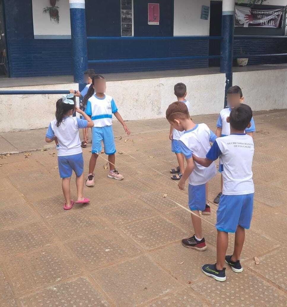 Na última aula foi realizada uma culminância no pátio da escola, quando os alunos praticaram novamente as brincadeiras aprendidas e ensinaram os colegas de uma turma do 2º ano. Além dos brinquedos confeccionados durante as aulas, foram incluídas as brincadeiras de pião e trancelim (elástico), tradicionais na região do Cariri. A culminância buscou reforçar a aprendizagem, a socialização e o reconhecimento do patrimônio cultural local. A Figura 4 mostra um momento dessa prática.