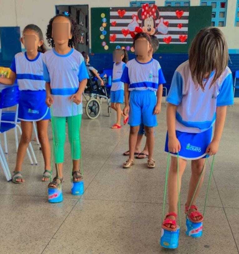 Figura 3: Alunos vivenciando a brincadeira da “perna de pau” durante a aula de Educação Física; Crato/CE, 2024