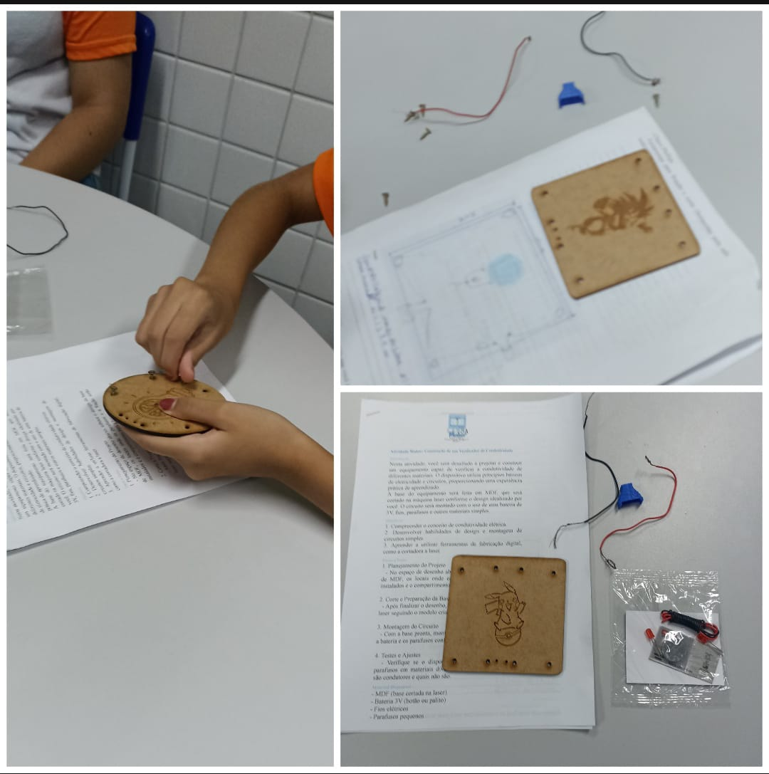 - Montagem do equipamento: os alunos montaram o circuito elétrico, conectando os fios ao LED e à bateria, fixando os componentes à base de MDF com parafusos.