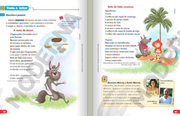 1º momento: Inicialmente, deve-se solicitar aos estudantes que, por meio das ilustrações e do título dos textos das páginas do livro didático apresentadas a seguir, identifiquem elementos que já conhecem. Nesse momento, é provável que os discentes façam referência à história da Chapeuzinho Vermelho, podendo relacionar o título “Cesta de doces” ao que a Chapeuzinho levava para sua avó. Após esse primeiro contato com os textos, pode-se pedir que a turma realize uma leitura oral compartilhada. Feita a leitura, perguntar aos estudantes qual texto fez mais sentido para eles. É provável que respondam que o texto em forma de poema não tenha feito sentido.