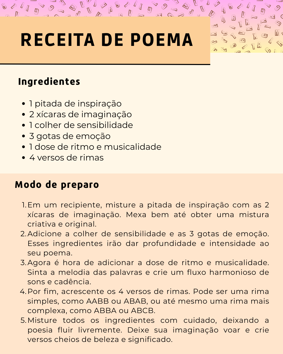 - Gêneros textuais: poema e receita (compreensão da estrutura de cada gênero e de seus elementos; no caso do poema: ritmo, musicalidade, figuras de linguagem e uso criativo da linguagem para transmitir emoções, sentimentos e ideias).